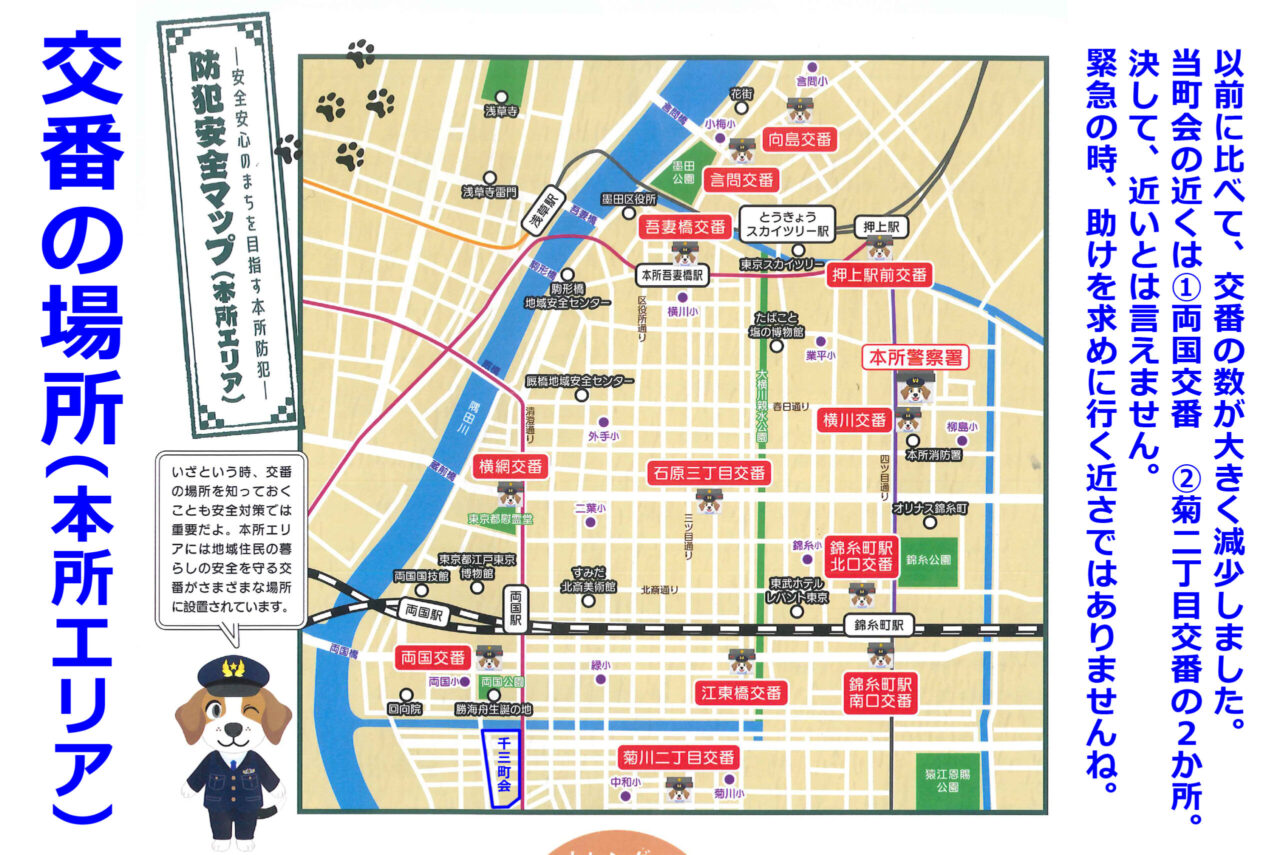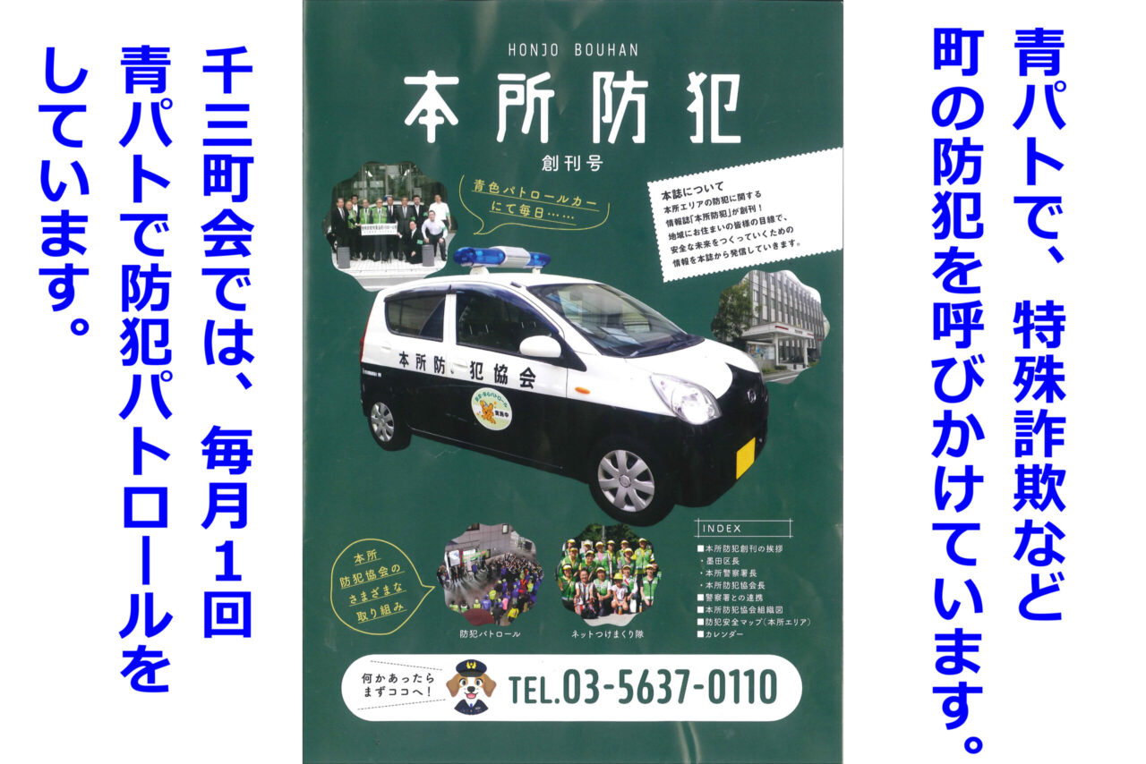 本所警察の山本署長から、増えている『特殊詐欺』に対して、各町会で十分警戒し て、町民の皆さんにお知らせくださいとのことです。また自転車の盗難も増えていま す。必ず施錠してください。また電動アシスト自転車はバッテリーの盗難が発生して います。バッテリーをはずして自宅に保管してくださいとのことでした。