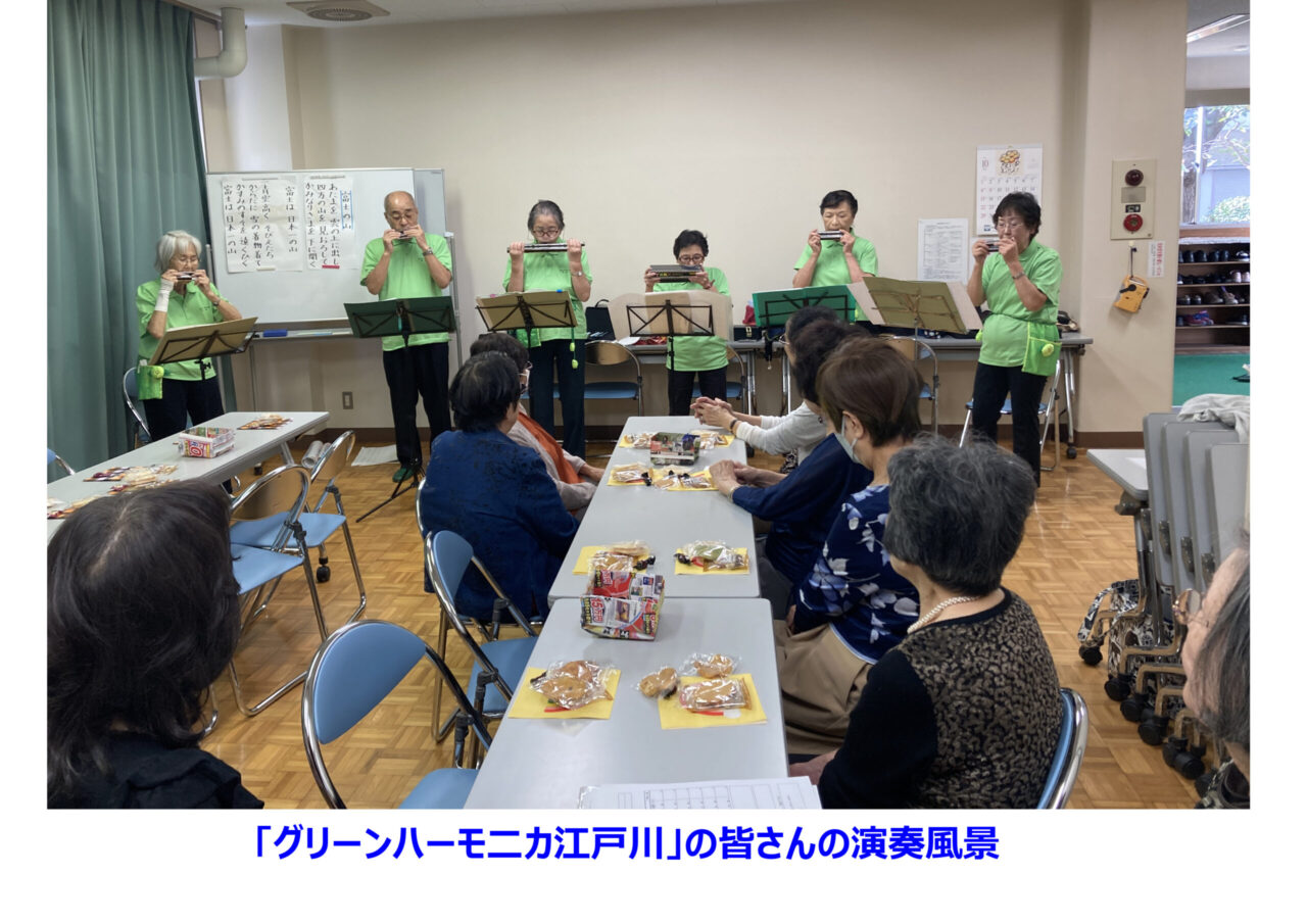 朝晩やっと過ごしやすくなり、秋の気配を感じられるようになりました。10月13日 (金)午後1時30分から千歳集会所1階で『グリーンハーモニカ江戸川』の6人の皆 さまをお招きして「ハーモニカ演奏会」を開きました。