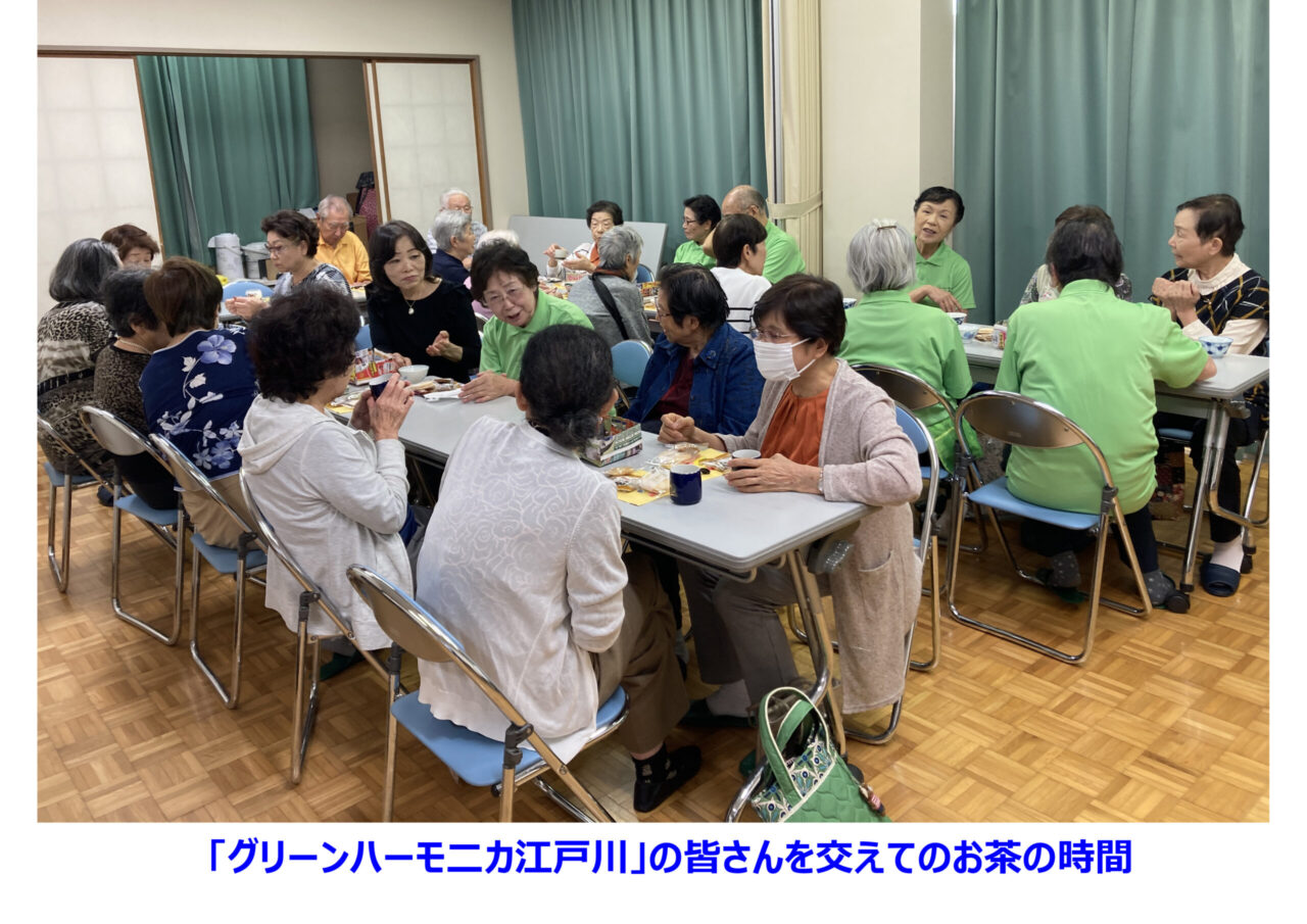 ハーモニカに合わせて、皆さん一緒に美声を発して合唱していました。楽しい時間 を過ごしました。演奏後『グリーンハーモニカ江戸川』の皆さんとお茶を飲みながら ハーモニカ談義に花を咲かせました。
