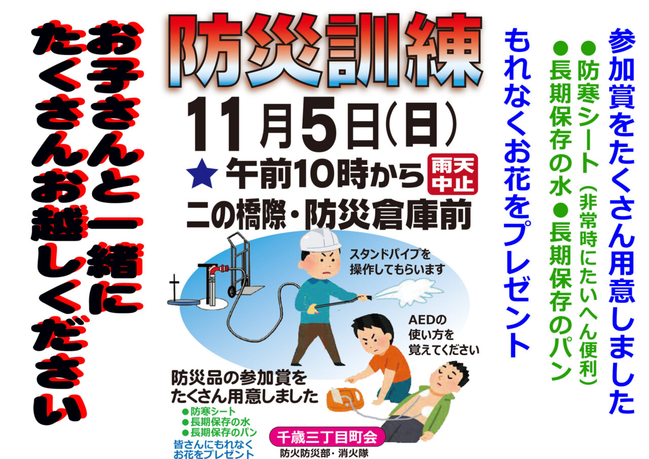 11月5日(日)午前10時から、二の橋際の防災倉庫前で、防災訓練を始めます。