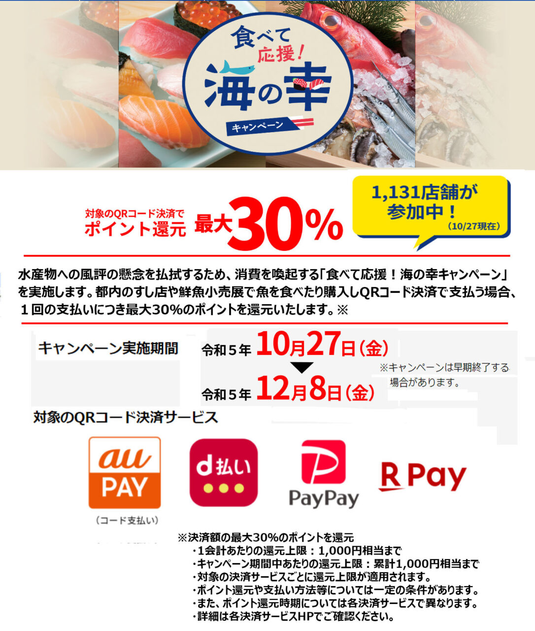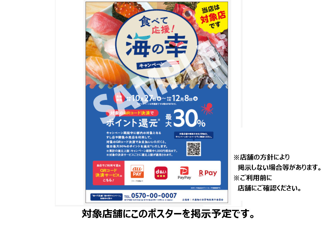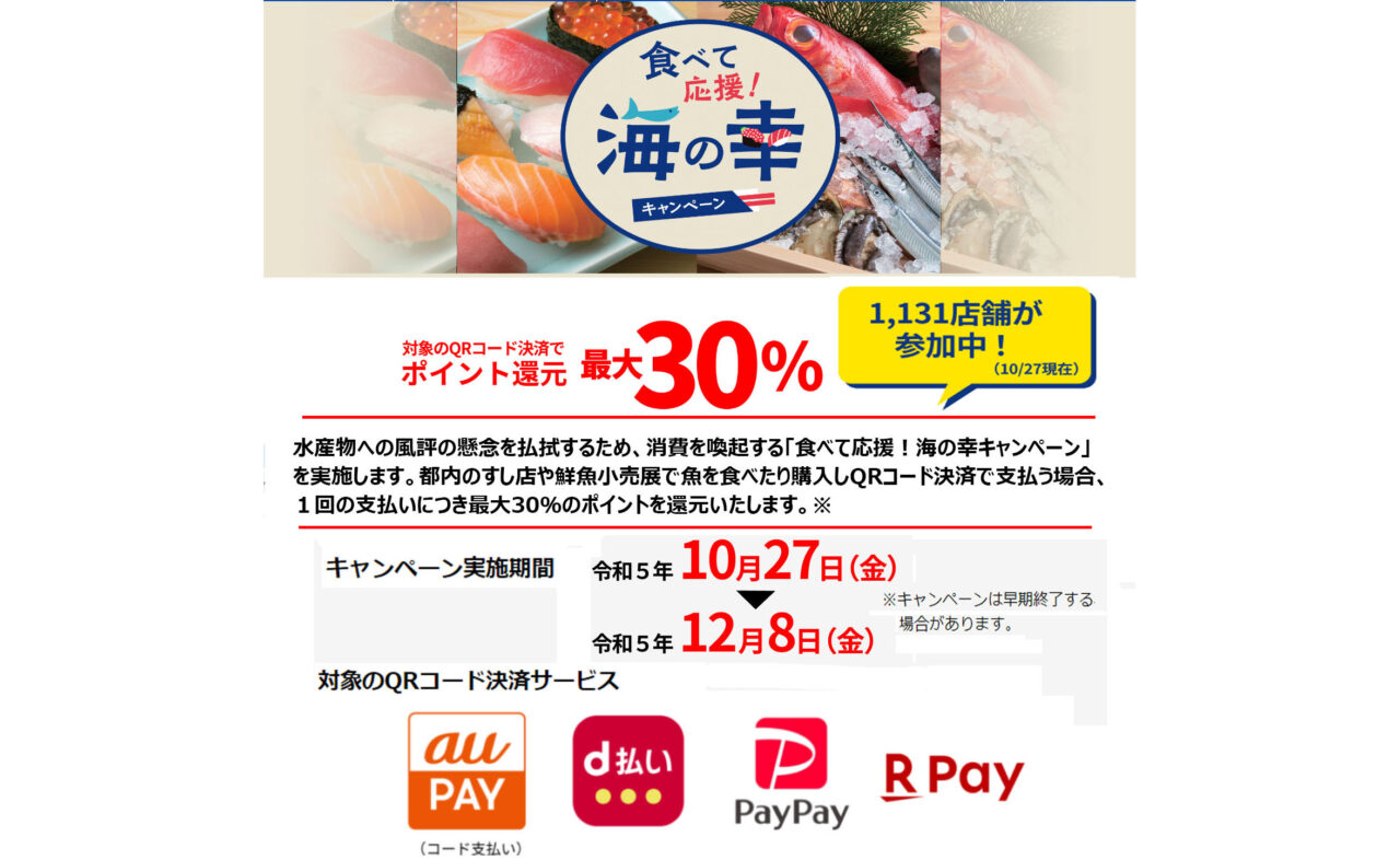 水産物への風評の懸念を払拭するため、消費を喚起する「食べて応援!海の幸 キャンペーン」を実施します。都内のすし店や鮮魚小売店で魚を食べたり購入しQR コード決済で支払う場合、1回の支払いにつき最大30%のポイントを還元します。※