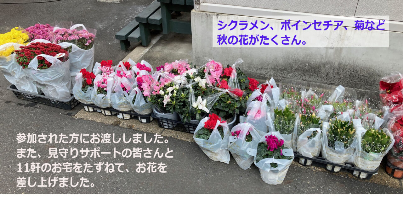 さらに、お出でになられなかったお年寄りのお宅に、見守りサポート隊の皆さ んと一緒に花をお届けしました。
