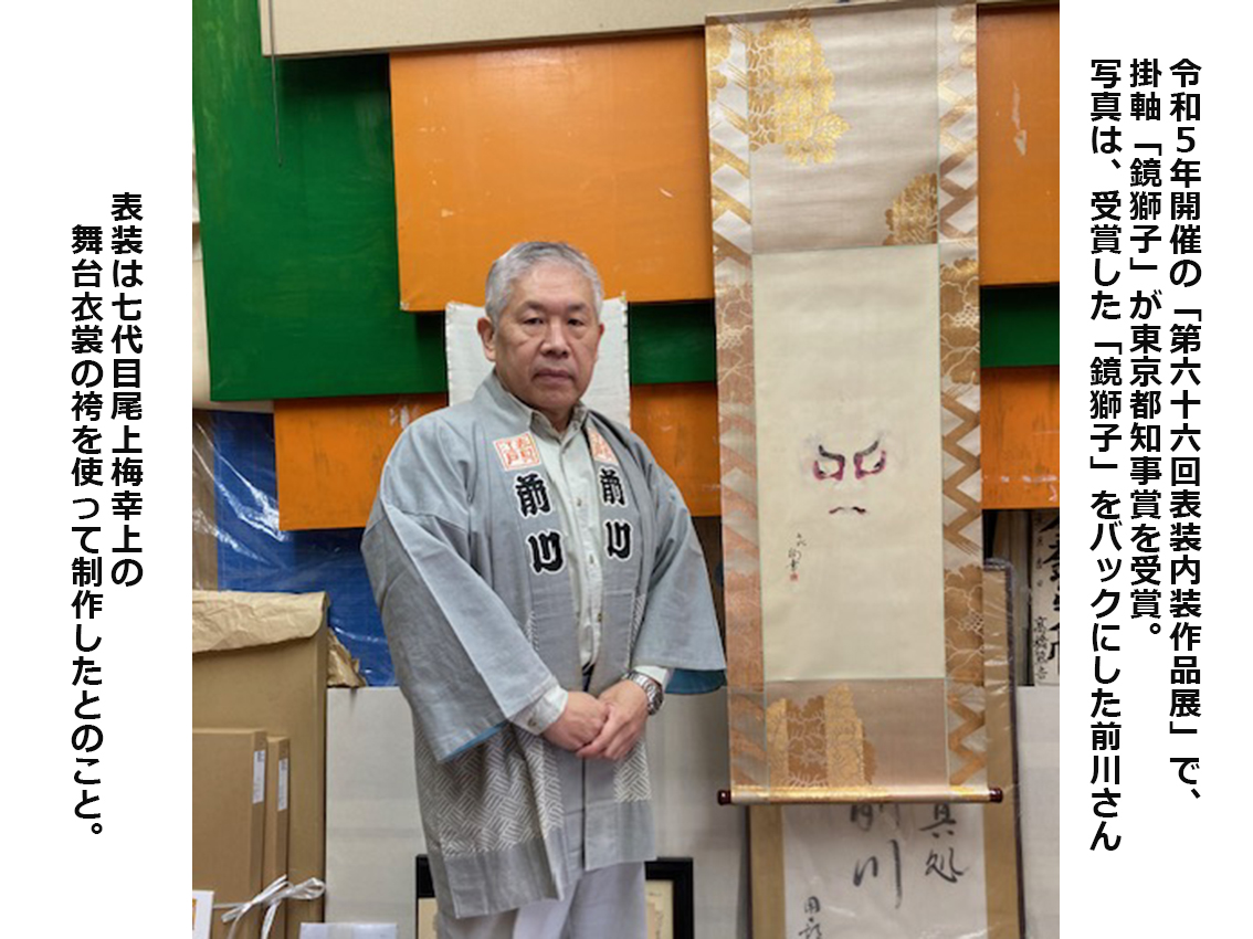 前川さんは表具の製作・修復に長年従事して培った知識・技能を有しており、歌舞伎 の隈取りを写した紙と舞台衣装の布地を合わせた掛軸を多く手掛け、伝統の技能・文 化の普及に貢献しています。