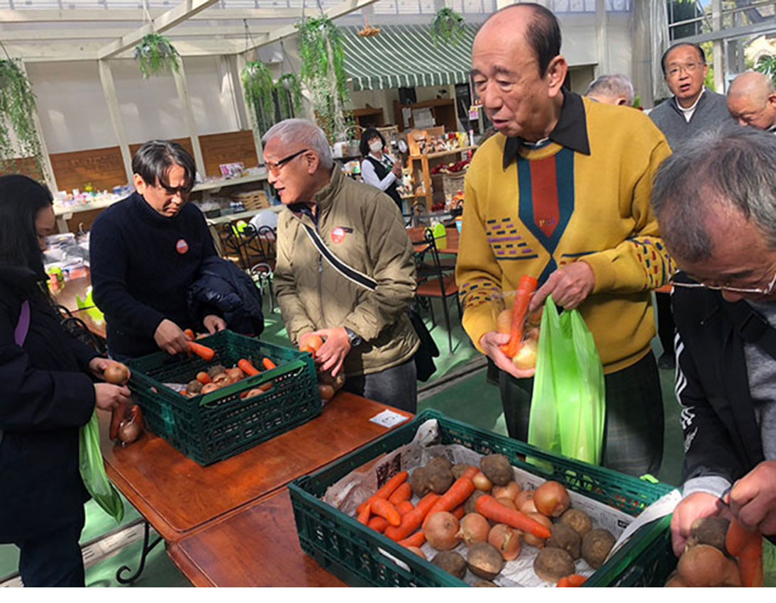 10時には最初のハーブ庭園に到着。温室には一面花が咲いて、本当にきれいでした。 また、野菜の詰め放題に皆さん、ビニール袋に玉葱、ニンジン、じゃがいもを詰め込 んでいました。また庭園のもみじは真っ赤に色づいていました。