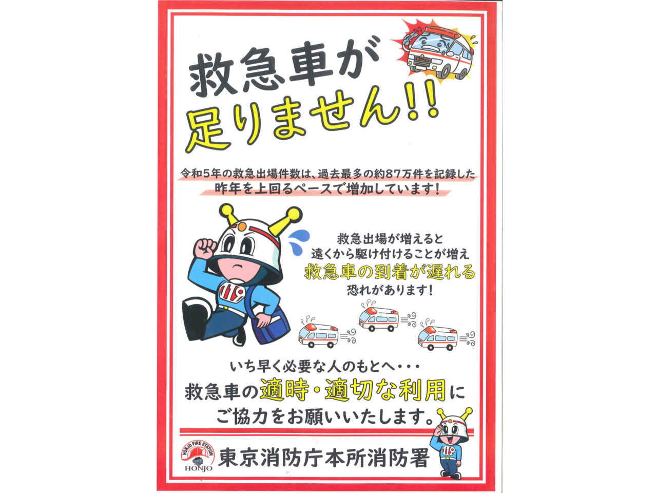 救命処置が必要な方など、本当に病院に行く必要がある人へ、一刻も早く救急車が到 着できるように、救急車の適時・適切な利用にご協力をお願いします。