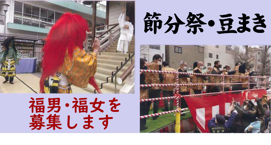 新着 【深川神明宮】節分・豆まきのご案内 post_entry@sen3.chokai.tokyo 2024年1月24日 鬼は外、福は内 令和6年甲辰(きのえたつ)歳の節分祭に当たり、福男・福女(豆まき参加者)を募 集します。皆さまのご参加をお待ちいたします。 「鬼は外、福は内」と邪鬼を払って清々しく新年を迎えましょう。 ●日時:令和6年2月3日(土)午後3時・儀式殿集合 神事の後、3時30分、豆まき。式後、儀式殿にて直会。 ●会費:10,000円 ●授与品:守り札、福豆、御神酒、折詰、供物 ※1月27日までに社務所へお申し込みください(定員100名)