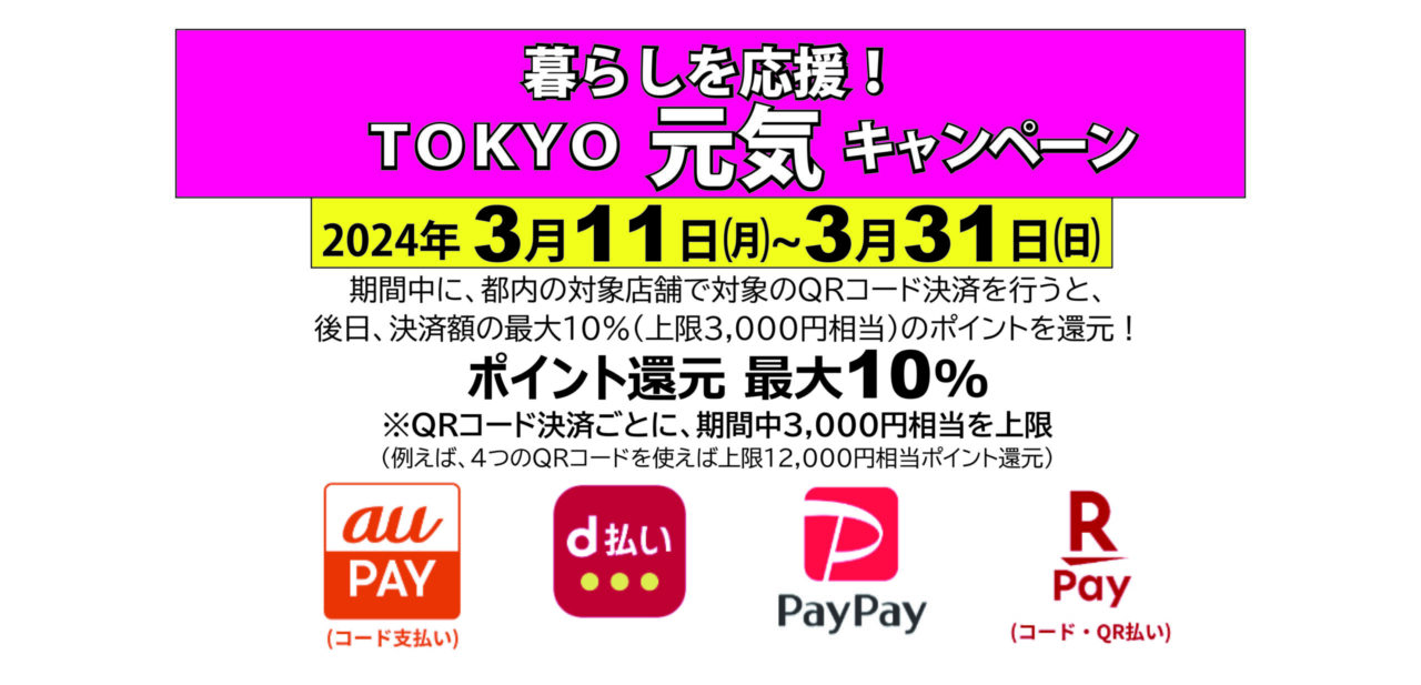 (還元額が予算額に達する見込みの場合は早期終了する予定) 対象のQRコード決済:au PAY(コード支払い)、d払い、PayPay、楽天ペイ(コー ド・QR払い) 還元の対象者:期間中に都内の対象店舗において対象のQRコード決済を行な えば都民でなくても可能 対象店舗: 対象のQRコード決済のいずれかを導入している(一部を除く)都 内の店舗