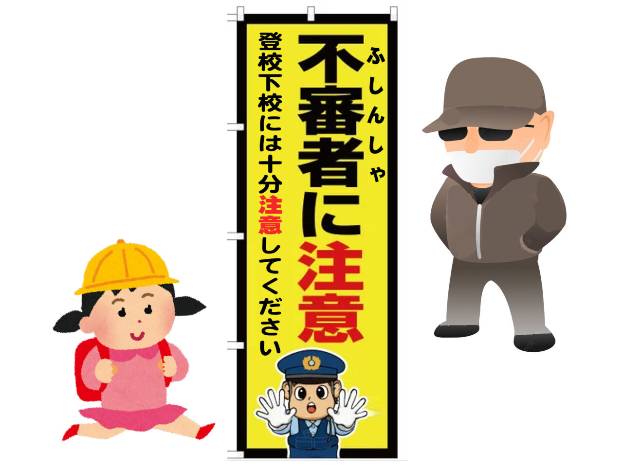 近くで、子どもに対する犯罪が起こっています。お子様には、少しでも「こわい」と思ったら、大声で助けを求めたり、防犯ブザーを鳴らすなどして、すぐに逃げるよう指導してください。
