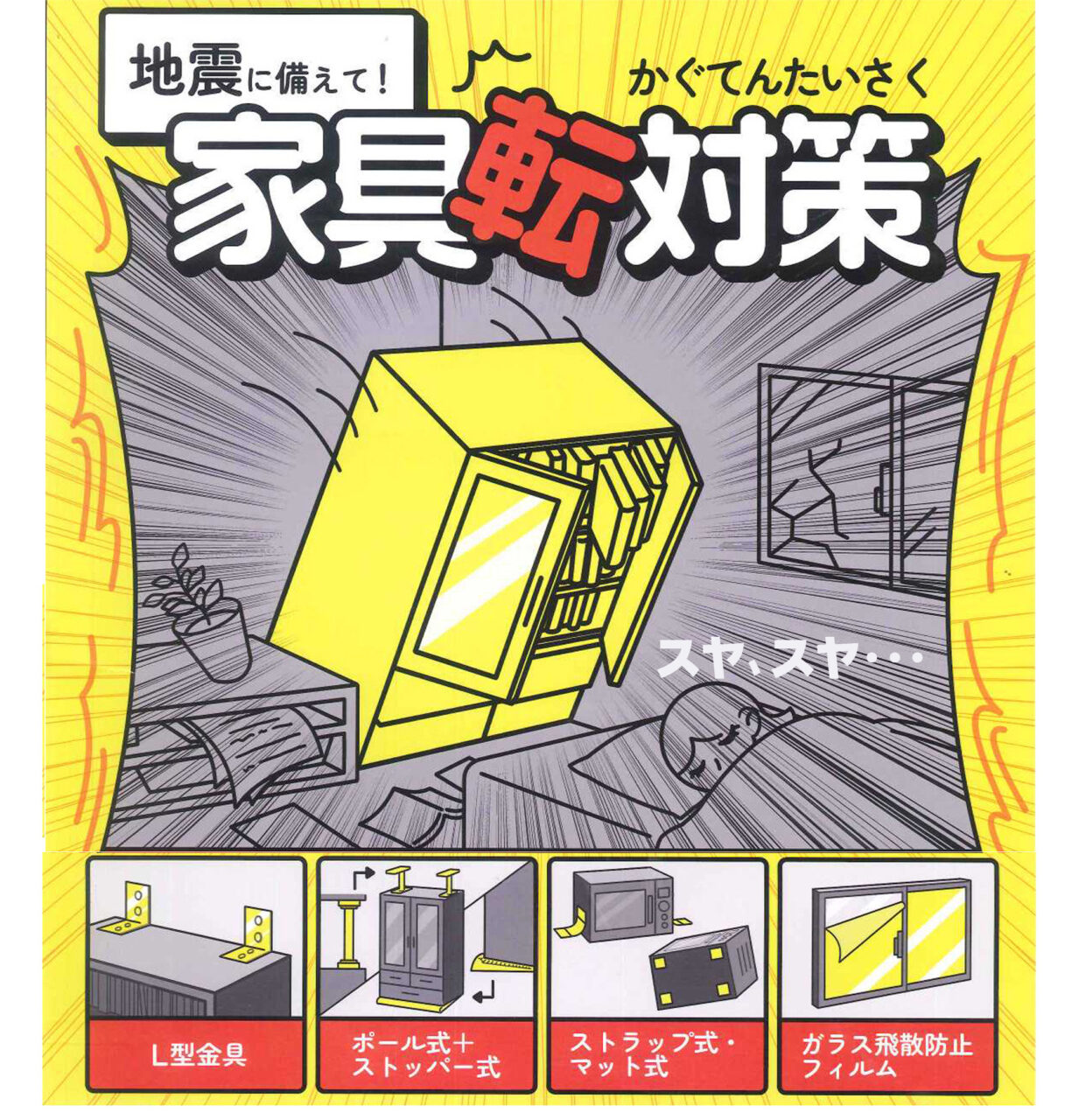 地震時に、家具類の転倒や窓ガラスの飛散による怪我を未然に防ぐため、未就学児の いるひとり親世帯に対し家具転倒防止器具等の取付け支援を行っています。