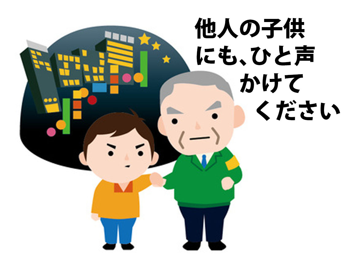 夜遅くまで公園で時間をつぶしたり、また遊んでいる子供を見かけた時は、「早く家 に帰りなさい」と一言かけてください。