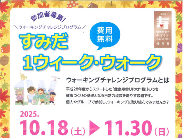 と題した取組みを平成29年度から実施しています。「すみだ1ウィーク・ウォーク」に参加し、楽しく歩いて一緒に健康づくりをしてみませんか?ウォーキングチャレンジプログラム