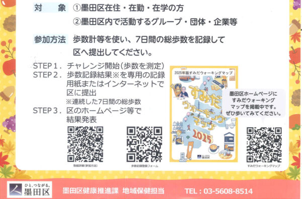 皆さんは、普段自分がどれくらい歩いているか知っていますか?成人(20歳から64歳まで)の1日の目標歩数は、男性が9,000歩、女性が8,500歩です。ウォーキングチャレンジプログラムでは、皆さんに7日間の歩数を測っていただき、その総歩数を区へ提出していただきます。参加者の歩数データの集計結果は後日公表します。今年は、以下のとおり開催する予定です。是非ご参加ください!