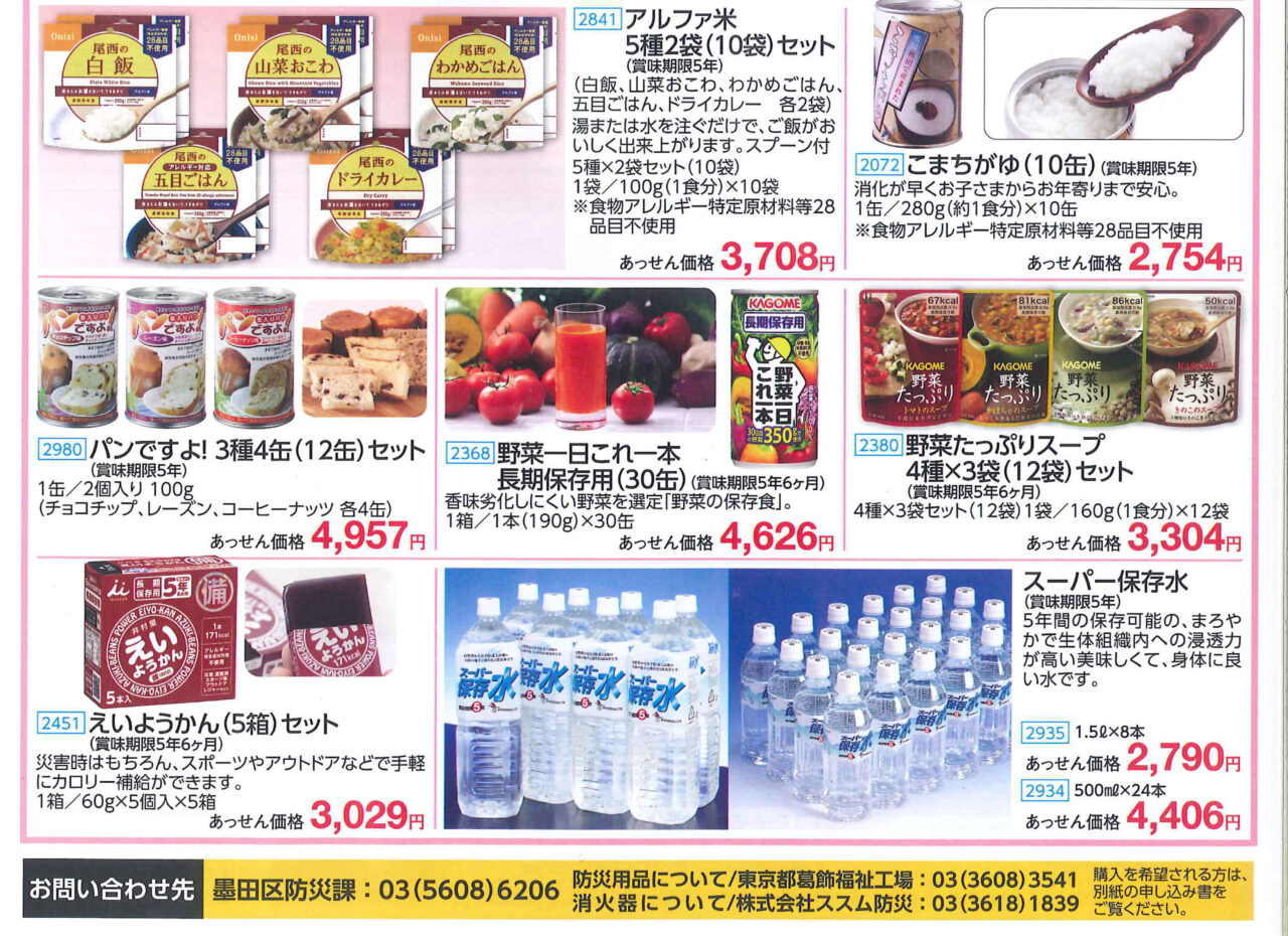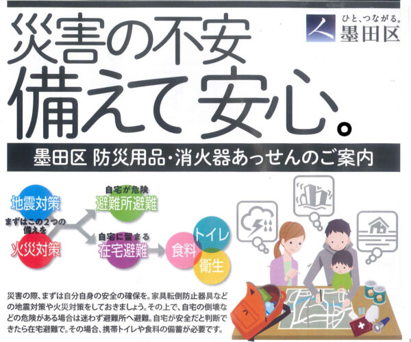 墨田区より 新着 防犯・防災 【墨田区】防災用品・消火器のあっせん hkato@p-shinko.co.jp 2025年10月19日 お問い合わせ先 墨田区防災課:電話03-5608-6206 防災用品について 東京都葛飾福祉工場:電話03-3608-3541 消火器について 株式会社ススム防災:電話03-3618-1839 ※購入を希望される方は、別紙の申込書を提出ください。