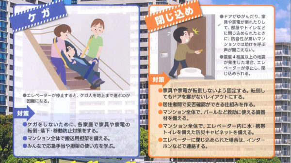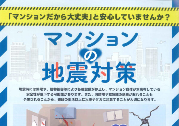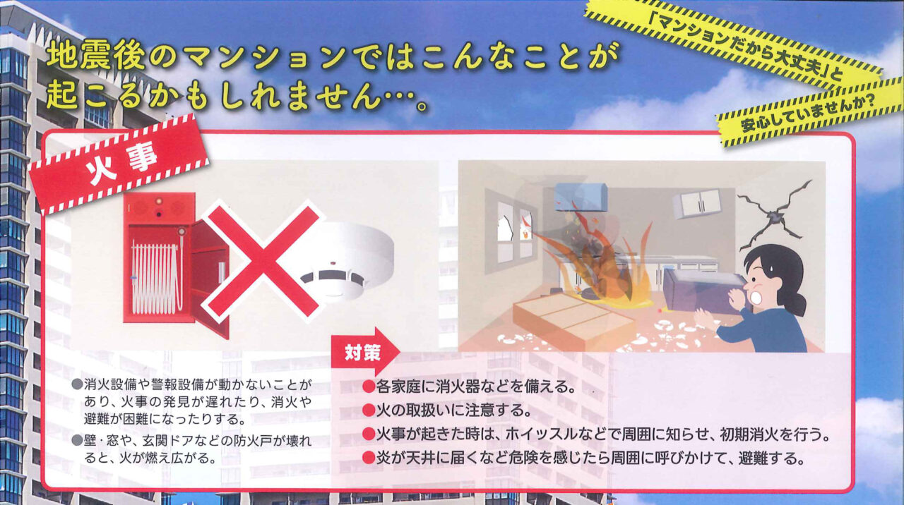 新着 防犯・防災 【地震】「マンションだから安心」と思っていませんか? hkato@p-shinko.co.jp 2025年10月20日 地震後のマンションで起こるかもしれないこと (1)火事 (2)ケガ (3)閉じ込め 地震後、エレベータが止まっていたら上り下りが大変! またトイレなど水が使えないことも考えなくてはいけない。