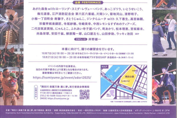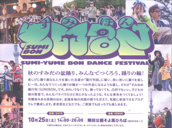新着 【墨田区より】秋のすみだの盆踊り hkato@p-shinko.co.jp 2025年10月20日 みんなでつくろう、踊りの輪!10/25(土)ですよ。 隅田公園そよ風広場で。14:00~20:00 おなじみの盆踊りの音頭のほか、全国各地の民謡の数々も交えて、気軽に参加ください。