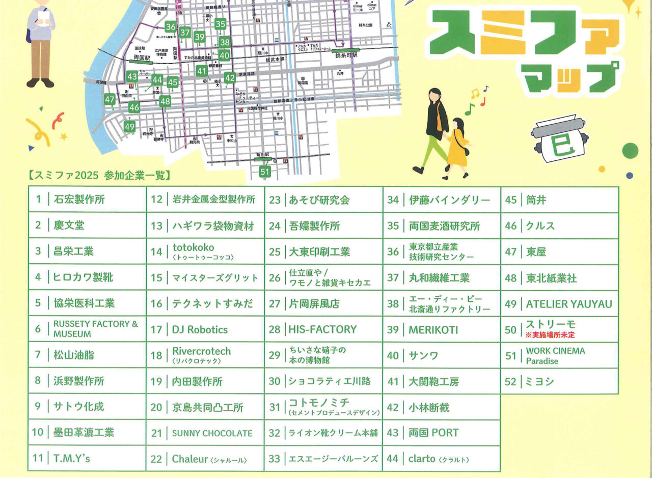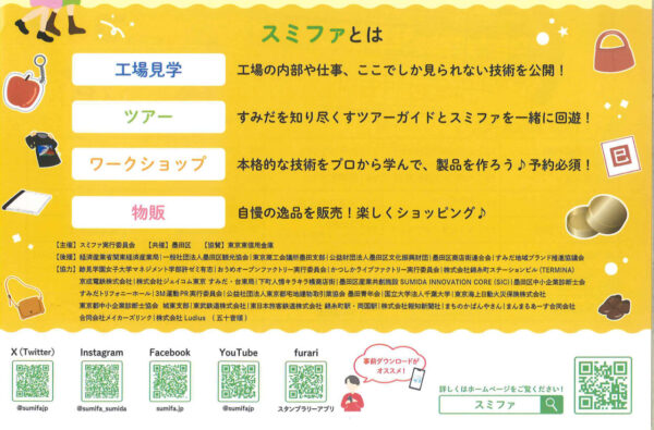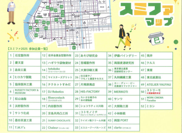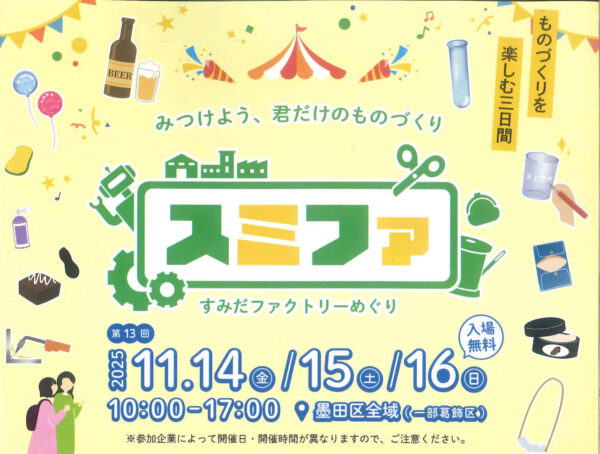 墨田区より 新着 【墨田区】すみだファクトリーめぐり hkato@p-shinko.co.jp 2025年10月22日 ものづくりを楽しむ3日間>11.14(金)~16(日) 見つけよう、ものづくり。 工場見学、ツアー、ワークショップ、物販など。 町内では48番の東北紙業社が参加しています。
