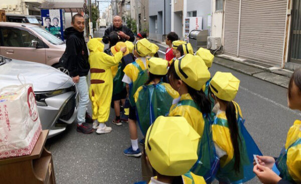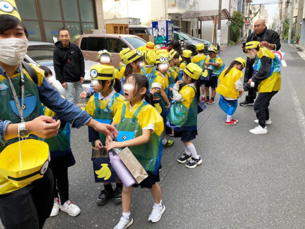 黄色い帽子と黄色い衣装、みんな、かわいい。とても元気で、これなら悪魔や亡霊はどこかへ逃げてしまうでしょう。みんなにお菓子を差し上げました!