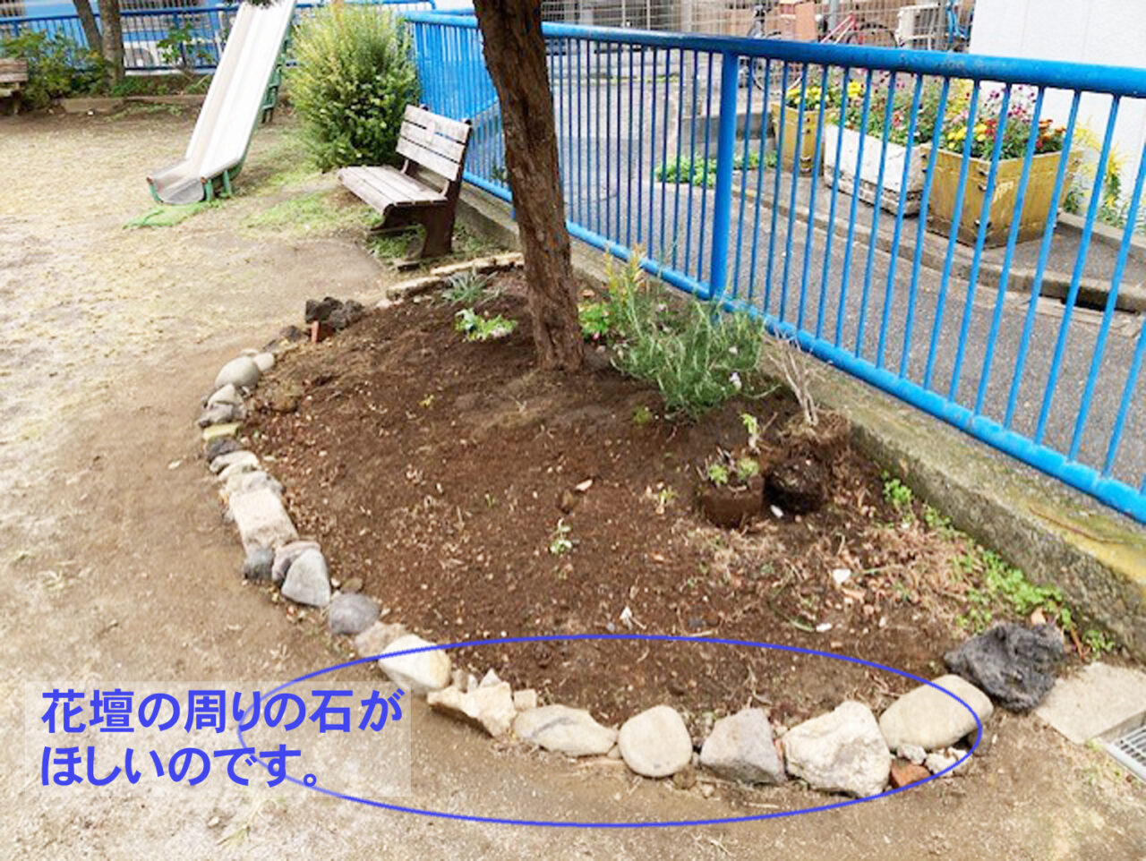 石は松沼さんが持っているものを利用しました。もっとほかに花壇を作りたいのですが、石が足りません。どなたか、このくらいの石があれば、公園に持ってきていただけますか。