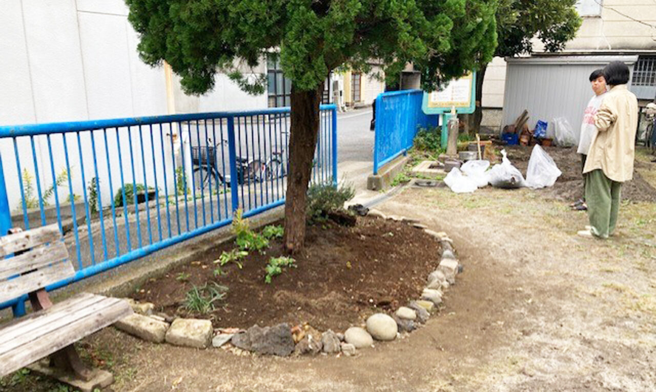 土を足してきれいになりました。ここに冬に咲く花を植える予定です。公園の入り口が明るくなります。