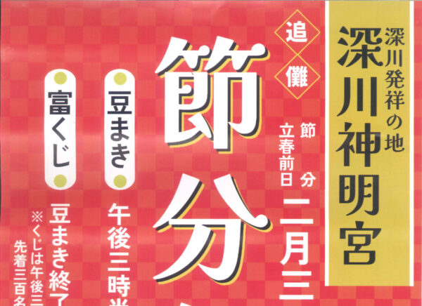 街路樹のこぶしの芽が少しづつ膨らんできました。恒例の深川神明宮の節分祭が2月3日に開かれます。