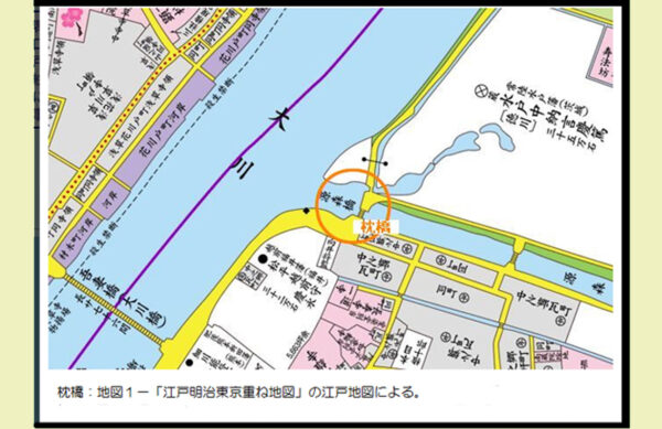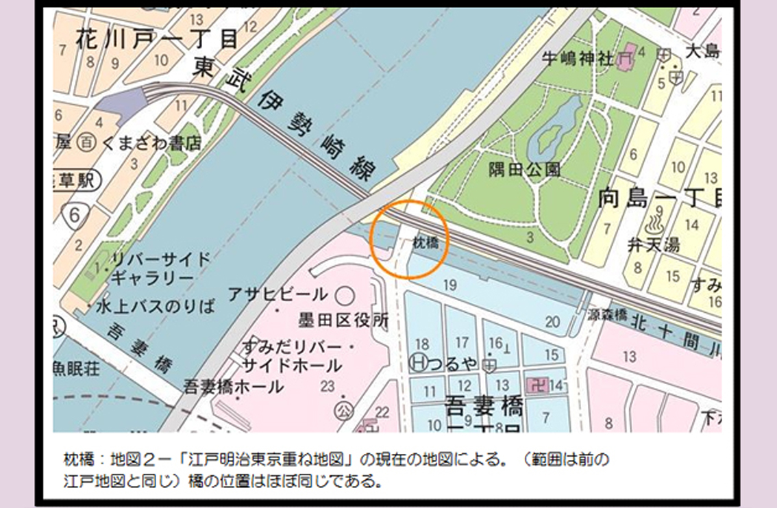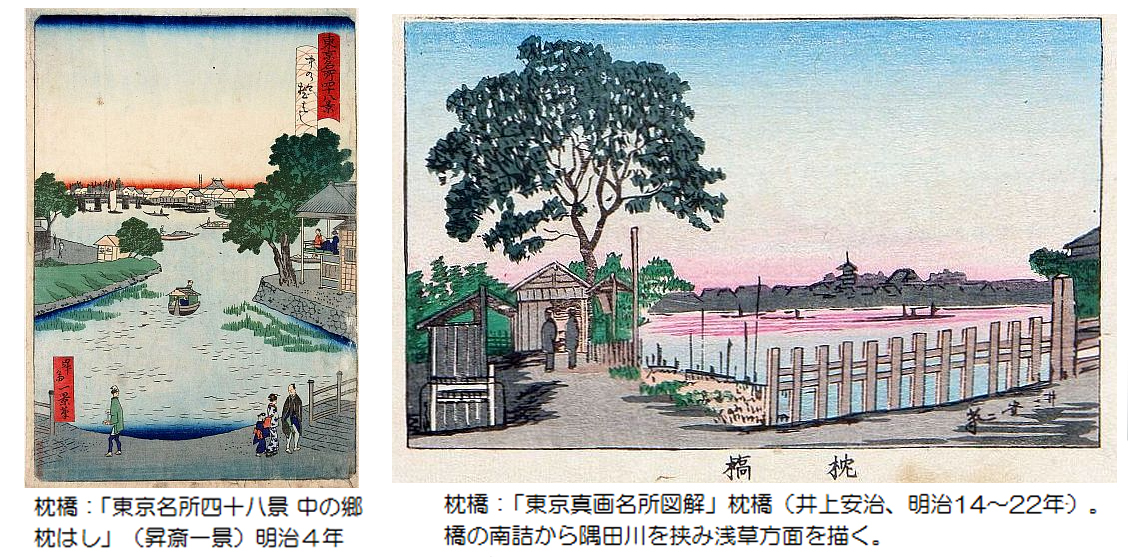 北側にあった水戸藩下屋敷前の掘割に架かる小橋、新小梅橋と合わせて「枕橋」とも呼ばれた。